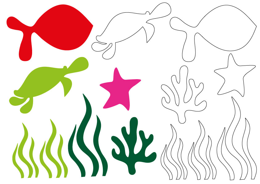 • Découper les différents motifs suivant le modèle téléchargeable et décorer le poisson, la tortue et l’étoile. Puis les coller sur la bouteille.