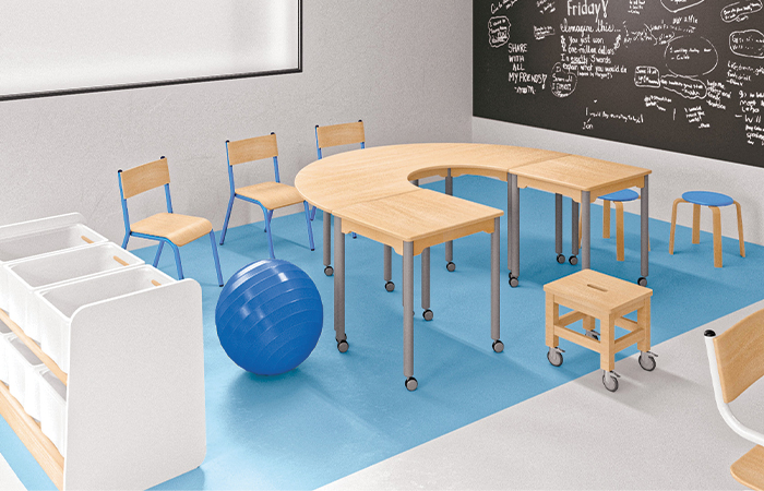 Le mobilier qui équipe la classe flexible est pensé pour favoriser le confort et la concentration des élèves : des sièges variés et de différentes hauteurs pour qu'ils puissent choisir celui qui leur convient le mieux (tabourets, poufs, ballon siège...), des rangements modulables (tables d'activités mobiles, meubles à bacs...), des tables et tableaux à roulettes pouvant être déplacés facilement.